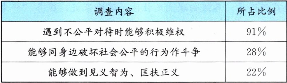 (1)①多数同学能够做到勇于维护自身权利,与发生在自己身上的非正义行为作斗争。②大部分同学还需提高维护社会公平正义的责任感。(每点2分,共4分)