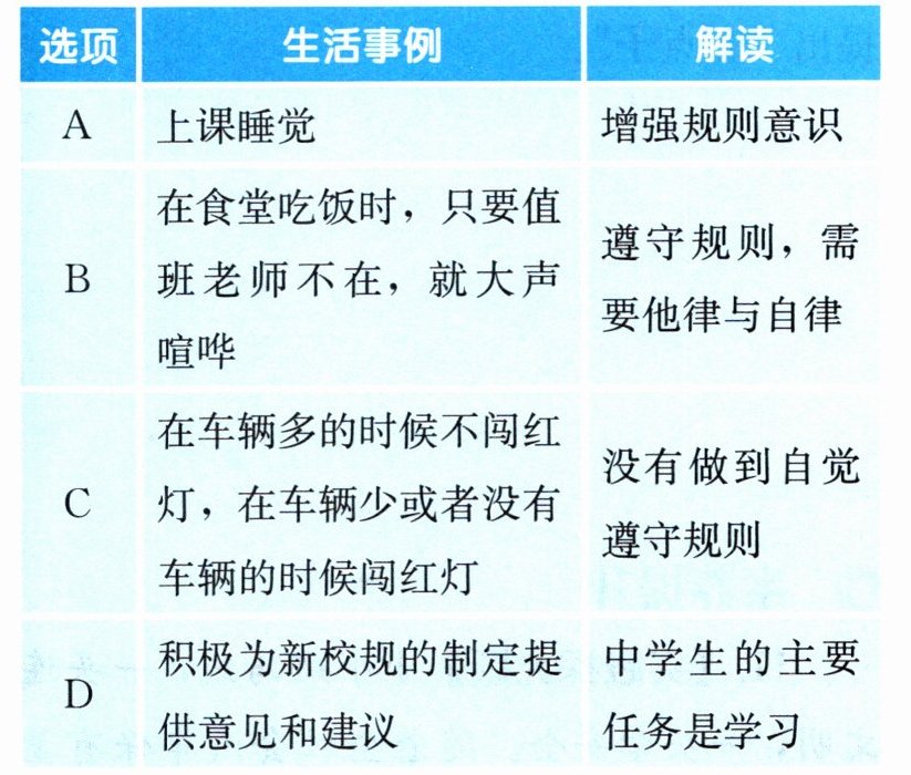8. 针对遵守规则的问题,同学们进行了交流。对下表中“生活事例”的解读不恰当的是(