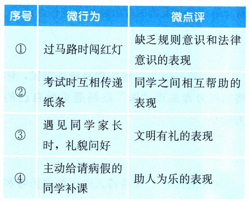 【解析】本题考查遵守规则、文明有礼、诚实守信、友善待人的相关知识。闯红灯是违反交通规则的行为,是缺乏规则意识和法律意识的表现,①正确;向同学家长礼貌问好是文明有礼的表现,③正确;主动给请病假的同学补课是助人为乐的表现,④正确;考试时互相传递纸条是违反考场纪律、不诚信的表现,②错误。故选C。