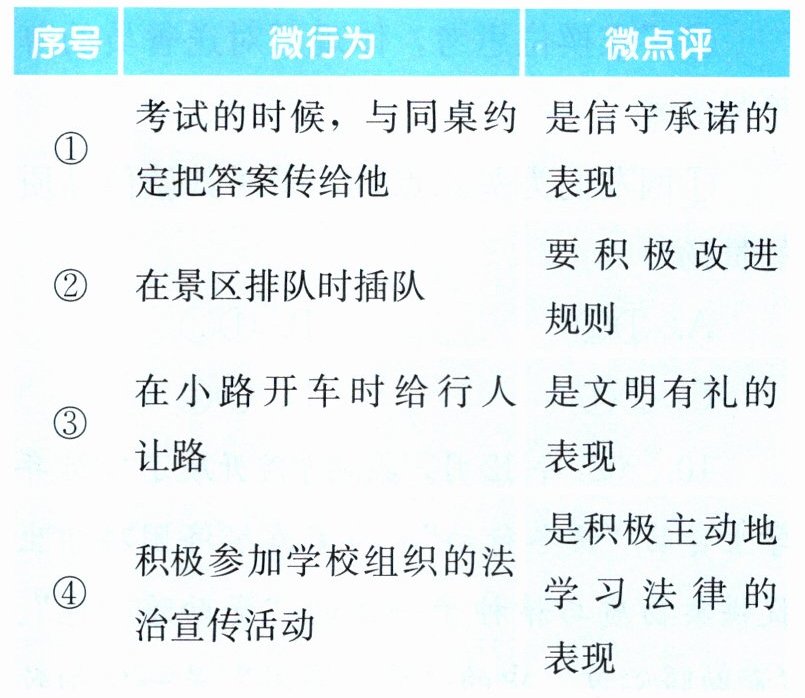 点拨 本题是一道判断类选择题,以表格形式切入,考查学生理解表格内容及运用知识解决实际问题的能力。解答此类题目,首先要明确题目设问考查方向,其次要与所学内容联系,明确考查点,最后综合判断,选出正确答案。本题表格中①是不诚信的行为,②是不遵守规则的行为,①②“微点评”错误;③是文明有礼的表现,④是积极主动地学习法律的表现,③④“微点评”正确。
