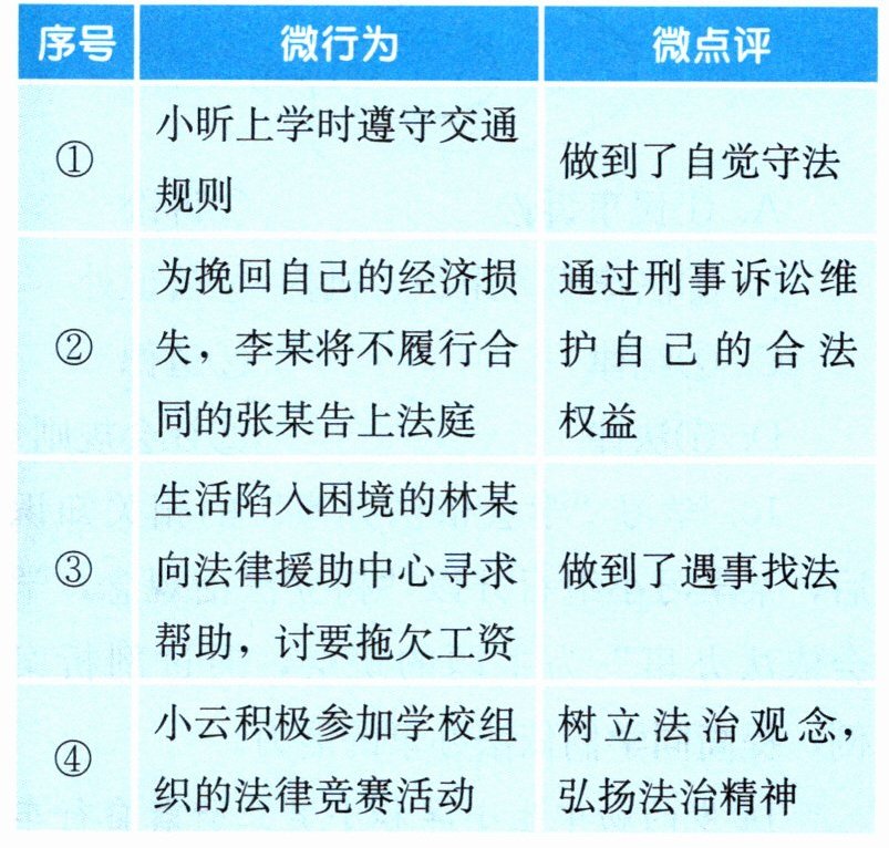 【解析】本题考查学会依法办事的相关知识。①中小昕的行为是自觉守法的表现,①正确;李某的行为是民事诉讼行为,②错误;林某通过法律援助中心寻求帮助,讨要拖欠工资,做到了遇事找法,③正确;小云的行为是树立法治观念的表现,④正确。故选C。