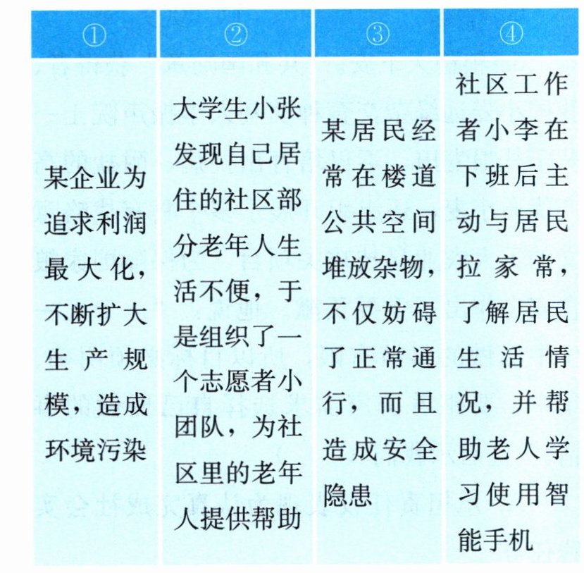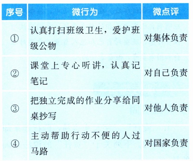 (2)①责任是一个人分内应该做的事情。②要积极承担责任,构建起人人有责、人人尽责的美好社会。③只有人人具有责任心,努力做到“我为人人、人人为我”,才能增进友谊和团结,共享更加幸福美好的社会生活。④我们要有强烈的主人翁意识和社会责任感,关心国家大事,将个人成长进步与国家社会发展紧密结合起来,以实际行动报效祖国、服务人民、奉献社会。