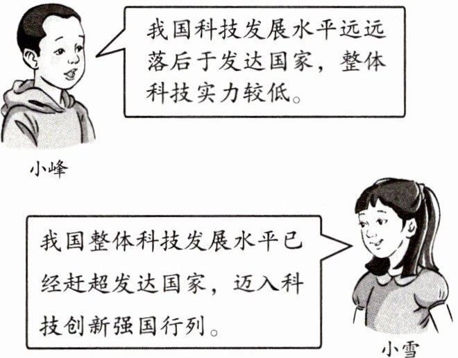 24.两位同学的观点都是错误的。党的十八大以来,我国加快推进科技自立自强,基础研究和原始创新不断加强,一些关键核心技术实现突破,战略性新兴产业发展壮大,成功进入创新型国家行列。同时,我们必须清醒认识到,我国推进高质量发展还有许多卡点瓶颈,科技创新能力还需进一步提高。我国要建成世界科技创新强国,任重道远。因此,小峰认为我国科技发展水平远远落后于发达国家、小雪认为我国整体科技发展水平已经赶超发达国家的观点都是错误的。