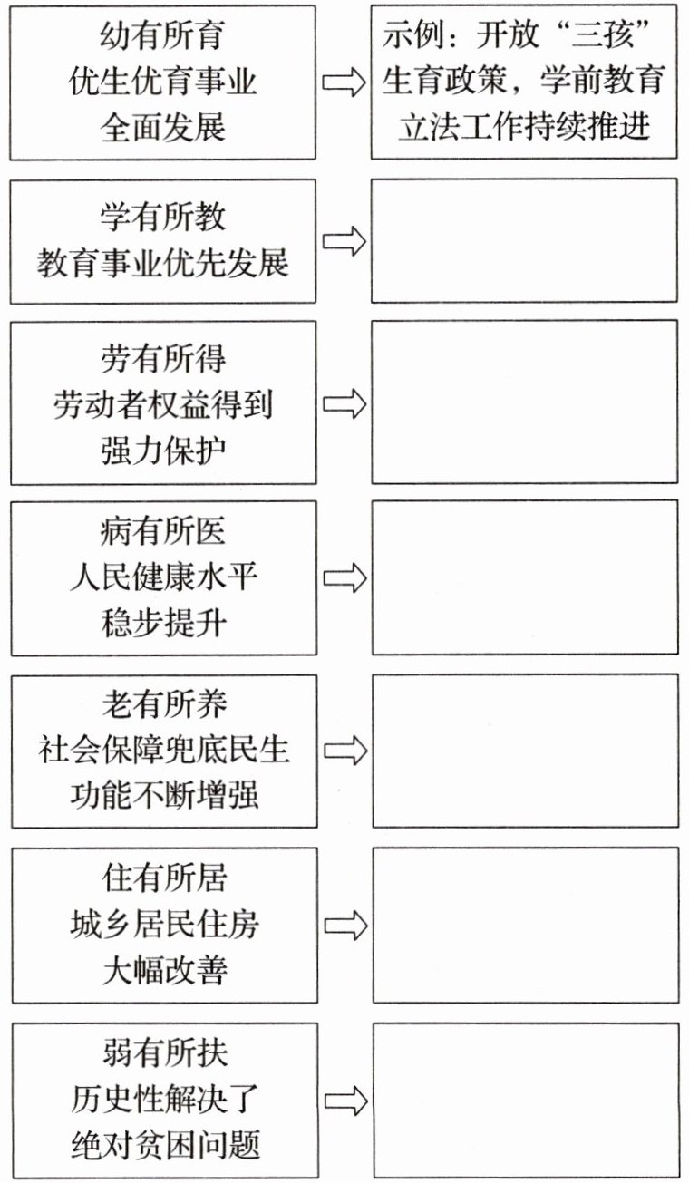 (2)共同富裕承载了人民对美好生活的向往和期盼。进入新时代,党和政府以民生建设扎实推动共同富裕。在下列内容中任选两个,列举我国改善此项民生的重要举措。(4 分)