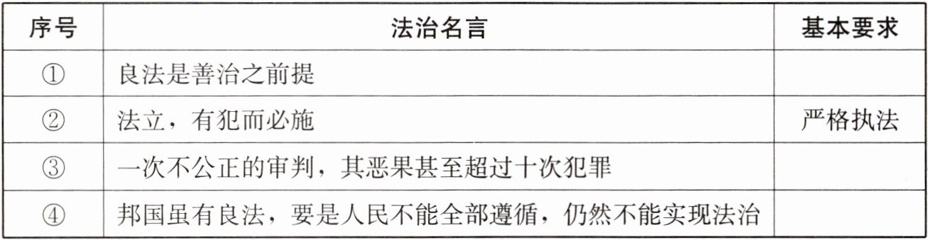 (1)上述法治名言体现了全面依法治国的哪些基本要求?请对应填入表格内。(3 分)
