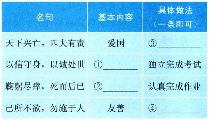 (1)①诚信;②敬业;③④为开放性试题,言之有理、符合题意即可。