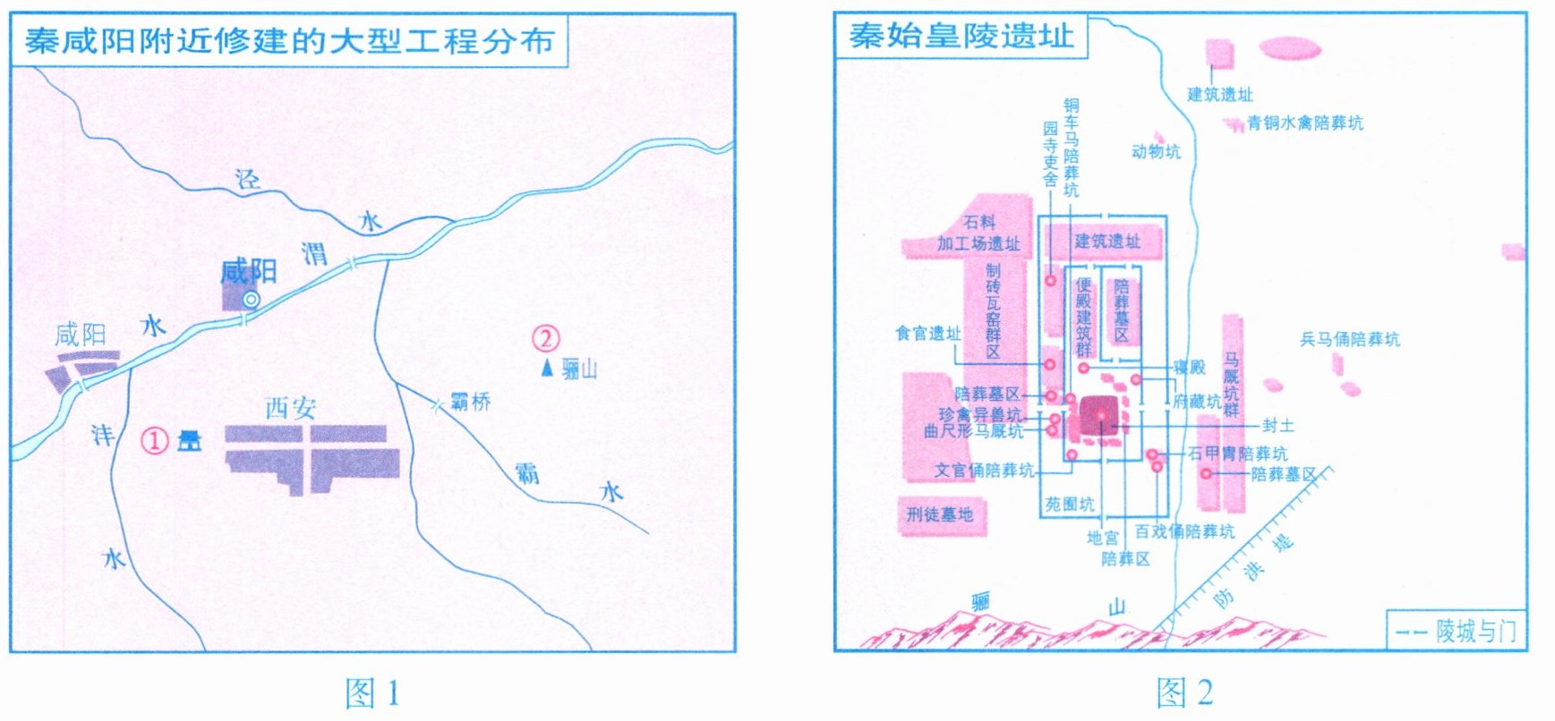 1. 图1中的①、②是秦始皇修建的宫殿和陵墓所在地,请分别填出它们的名称: