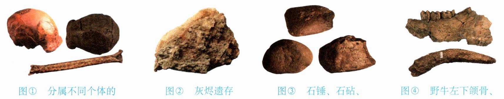 |图① 分属不同个体的人类化石(模型)|图② 灰烬遗存|图③ 石锤、石砧、砍砸器|图④ 野牛左下颌骨、羚羊角化石|
