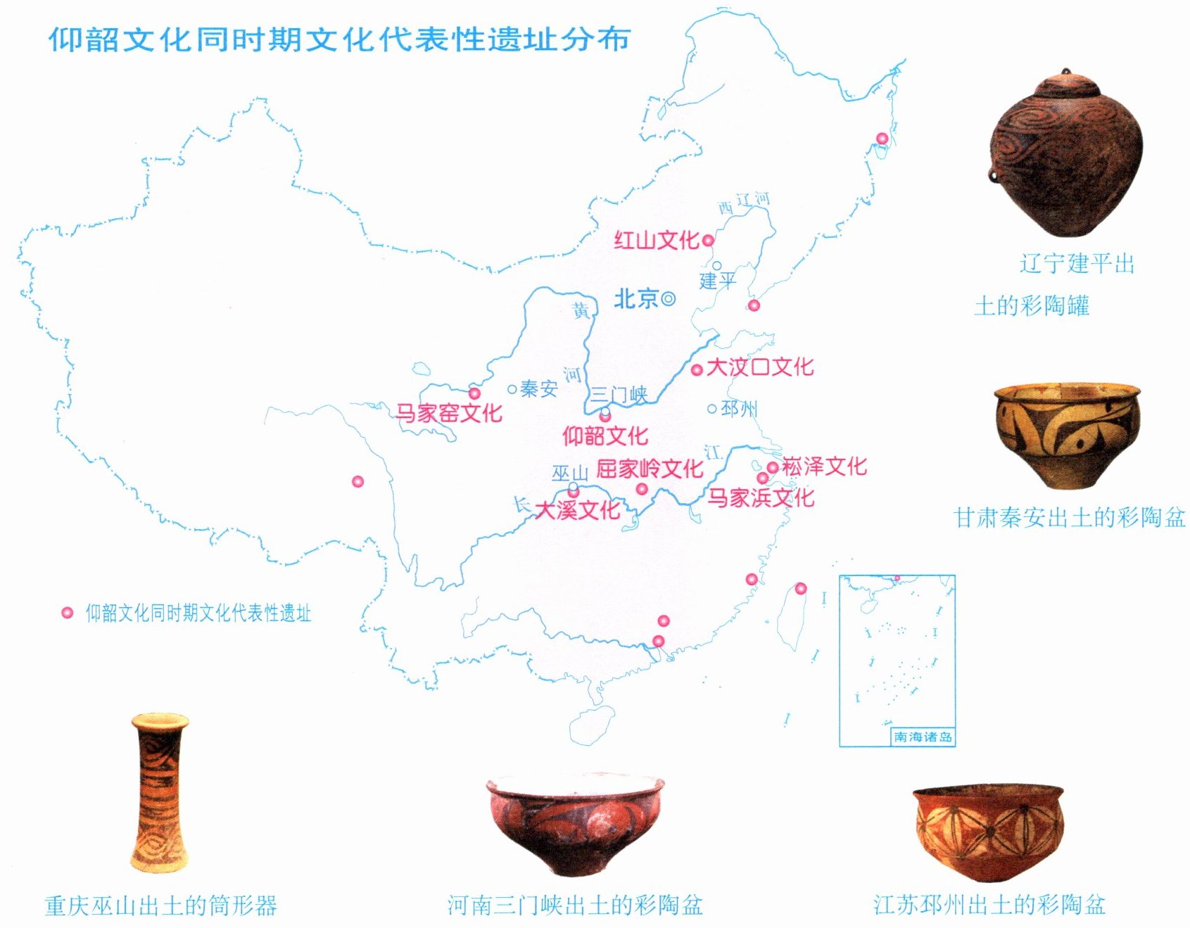 材料 仰韶文化以彩陶的发达在诸新石器文化中独具特色……这类彩陶器皿,在整个仰韶文化中随处可见,但很难给予区别,整个文化的面貌高度统一。随着文化的凝聚力空前增强,仰韶文化开始向外大幅度扩张,如原本很少有人活动的陕北及河套地区,这个时期也出现了密集的仰韶聚落。不仅如此,仰韶风格的彩陶在其他文化中也有发现,其文化的影响力达大半个中国。