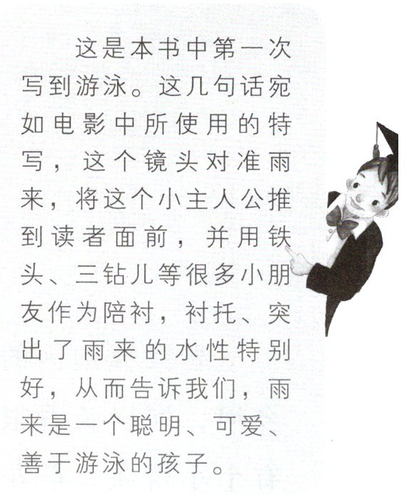 雨来最喜欢这道紧靠着村边的还乡河。每到夏天,雨来和铁头、三钻儿,还有很多很多光屁股的小朋友,好像一群鱼,在河里钻上钻下,藏猫猫、狗刨、立浮、仰浮。雨来仰浮的本领最高,能够脸朝天在水里躺着,不但不沉底,还把小肚皮露在水面上。