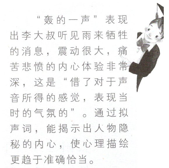 李大叔听说,脑袋轰的一声,耳朵叫起来,眼泪流下来,就一股劲儿地跟着人们向河岸跑。到了河岸,别说尸首,连一滴血也没看见。大家呆呆地在河岸上立着。河边静静的,河水打着漩涡哗哗地向下流。虫子在草窝里叫着。不知谁说:“也许雨来被鬼子扔在河里冲走了!”