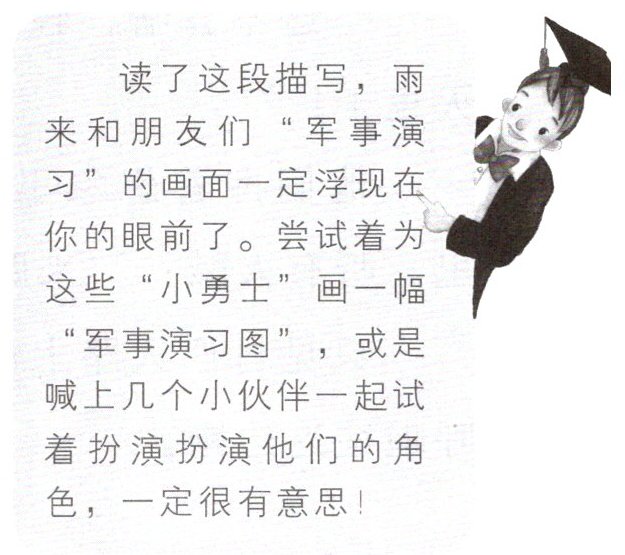 雨来和小朋友们,用木棍和秫秸秆儿当步枪,学军队练操。每个人把自己所保存的八路军衣物,都穿挂在身上了。铁头戴一顶八路军伤员送给他的破军帽。帽子洗过以后,变得皱巴巴的。铁头不住地转动着脑袋,从帽檐底下射出两道又庄重又严肃的目光,鼓着嘴巴。瞧他那股神气劲儿,就好像这一顶帽子把他全身都武装起来了。