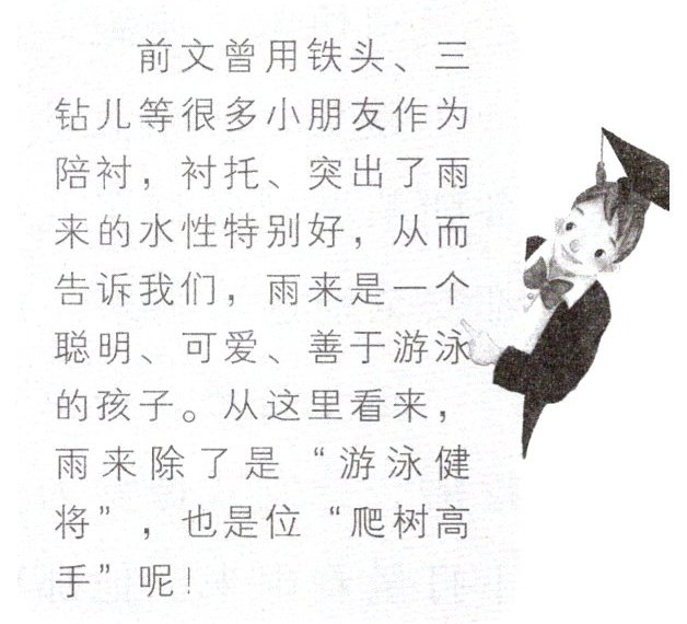 前文曾用铁头、三钻儿等很多小朋友作为陪衬,衬托、突出了雨来的水性特别好,从而告诉我们,雨来是一个聪明、可爱、善于游泳的孩子。从这里看来,雨来除了是“游泳健将”,也是位“爬树高手”呢!