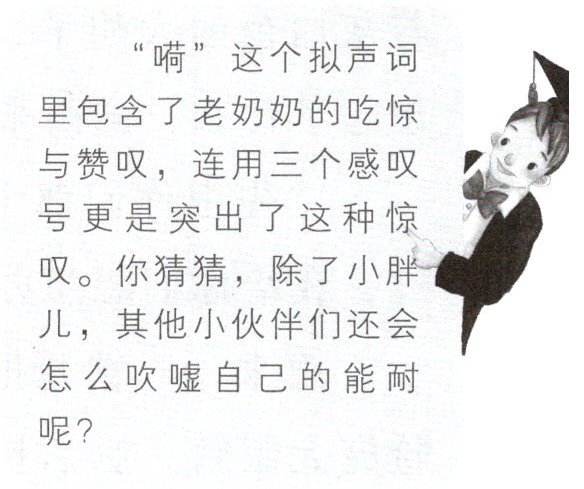 于是孩子们七嘴八舌,乱哄哄,吹嘘自己的能耐。老奶奶不知道应该回答谁的话了,只是吃惊地睁大眼睛,赞叹说:
