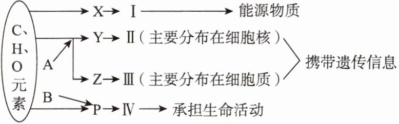 下图表示细胞内某些有机物的元素组成和功能,其中 A、B 代表元素,Ⅰ、Ⅱ、Ⅲ、Ⅳ是生物大分子,图中 X、Y、Z、P 分别为构成生物大分子的基本单位。请回答下列问题。
