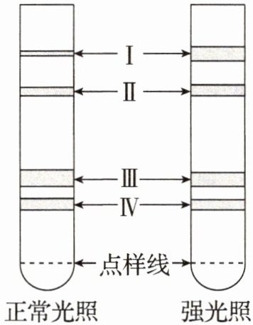3. 将某种植物幼苗分别在正常光照和强光照条件下培养一段时间后,分别提取分离叶绿体中的色素,结果如图所示(Ⅰ、Ⅱ、Ⅲ、Ⅳ表示相应的色素带)。下列叙述正确的是(