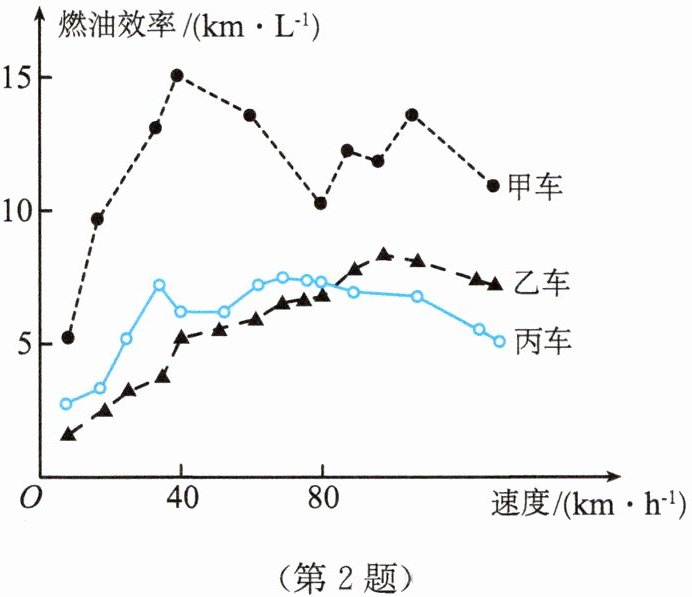 2. 汽车的“燃油效率”是指汽车每消耗$1\mathrm{L}$汽油行驶的里程,甲、乙、丙三辆汽车在不同速度下的燃油效率情况如图所示. 下列叙述中正确的是(