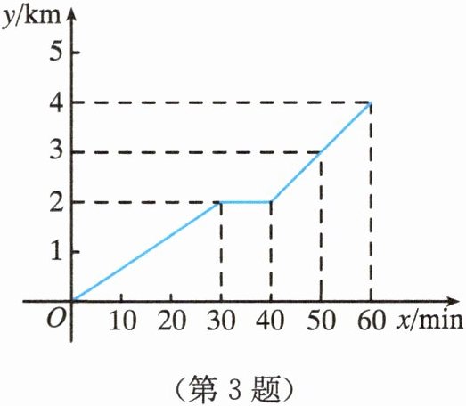 3. 甲同学从家出发步行去乙同学家,途中经过一个公园时休息了$10\mathrm{min}$. 甲走过的路程$y$(单位:$\mathrm{km}$)随时间$x$(单位:$\mathrm{min}$)的变化情况如图所示,则$y$关于$x$的函数解析式为