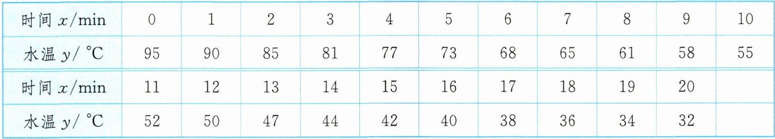 选取已知数据中的 $ x = 0 $ 和 $ x = 20 $ 对应的水温 $ y $ 的值,可以确定函数模型 $ y = ke^{ax} $ 中的参数值 $ a \approx -0.0544 $,$ k = 95 $. 所以能近似反映这个试验中水温与时间之间关系的函数解析式是 $ y = 95e^{-0.0544x} $.