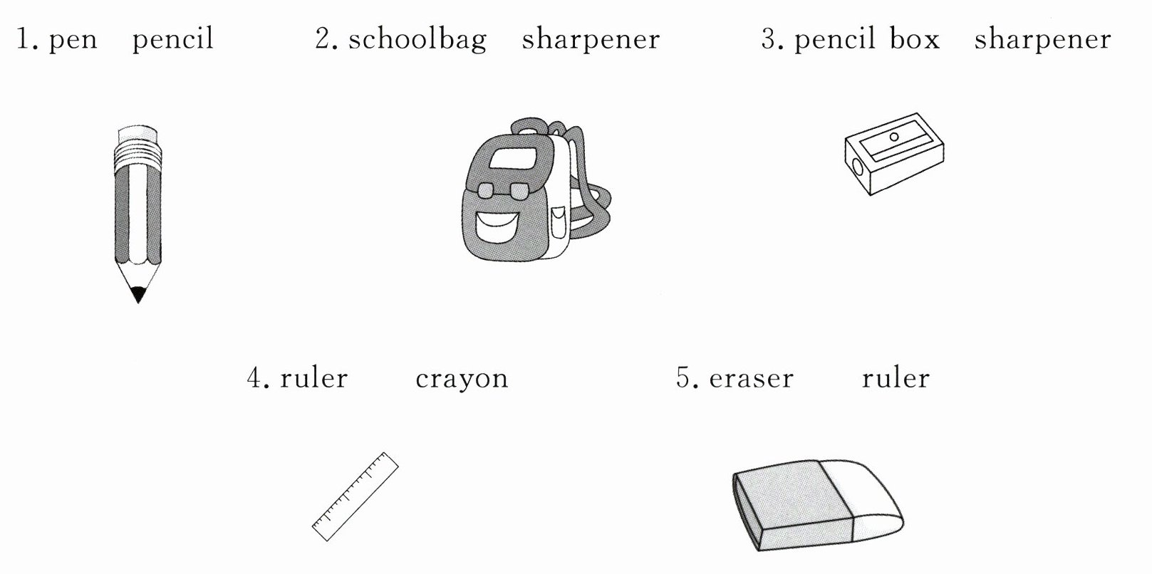 Ⅴ.1.pencil 2.schoolbag 3.sharpener 4.ruler 5.eraser