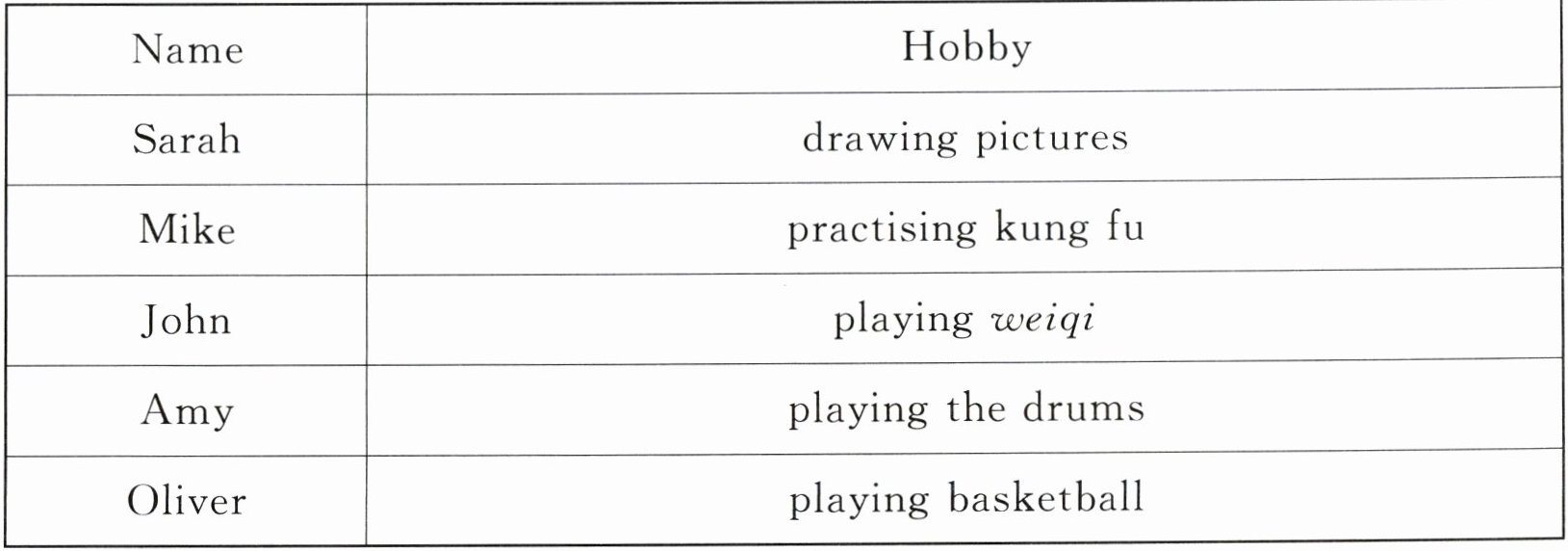 1.I like playing the guitar. 2.I like practising kung fu. 3.They are good at playing weiqi. 4.I listen to music. 5.He reads books in the morning.