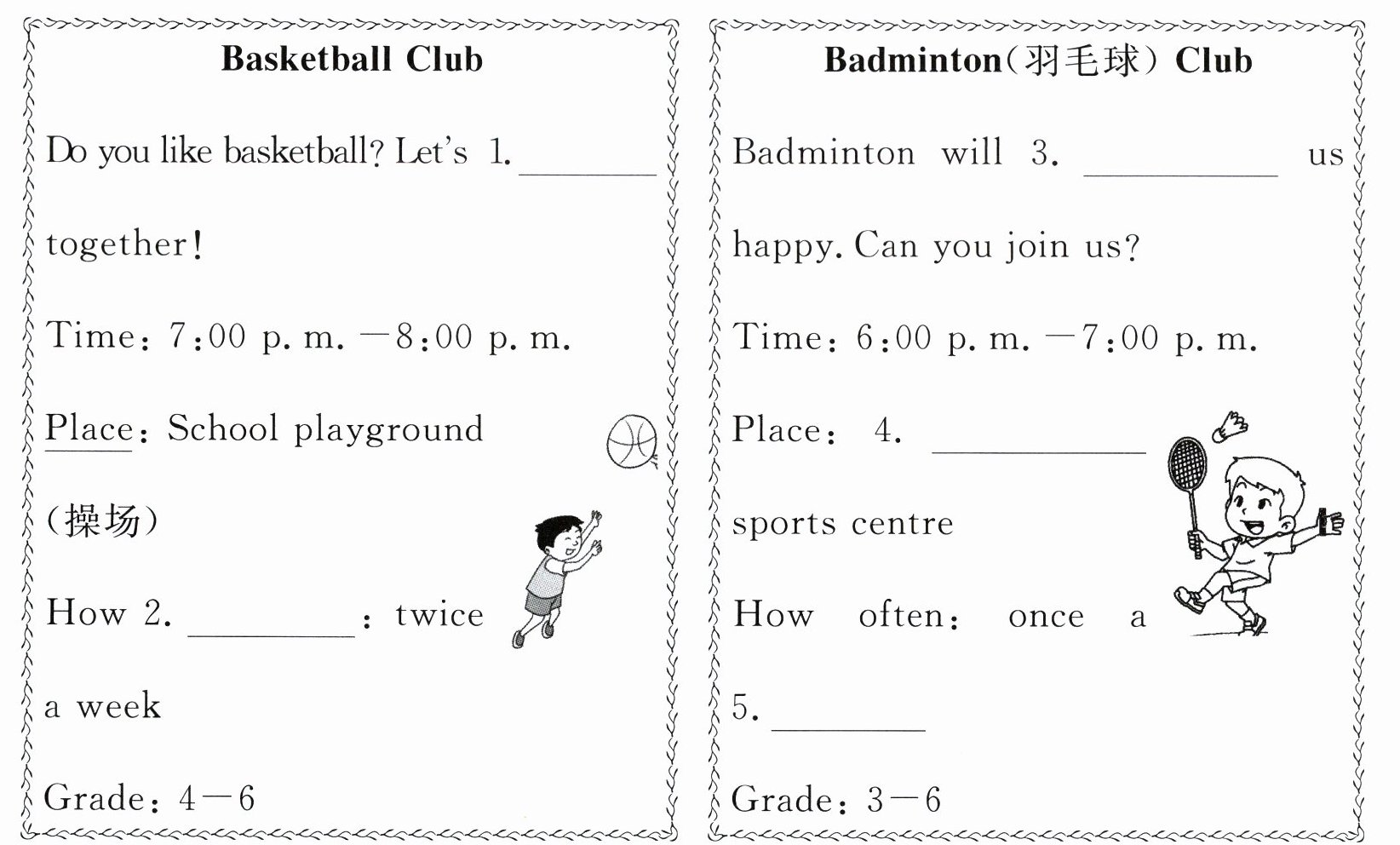 Hello! My name is Lily. I'm in Grade 4. I'm good at playing badminton. I play it twice a week. I want to join in Badminton Club.(答案不唯一)