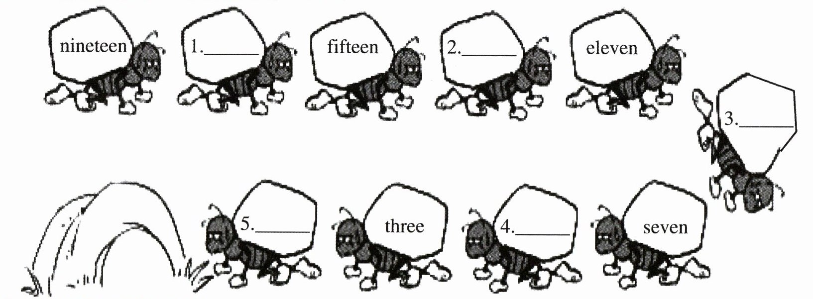 1.seventeen 2.thirteen 3.nine 4.five 5.one