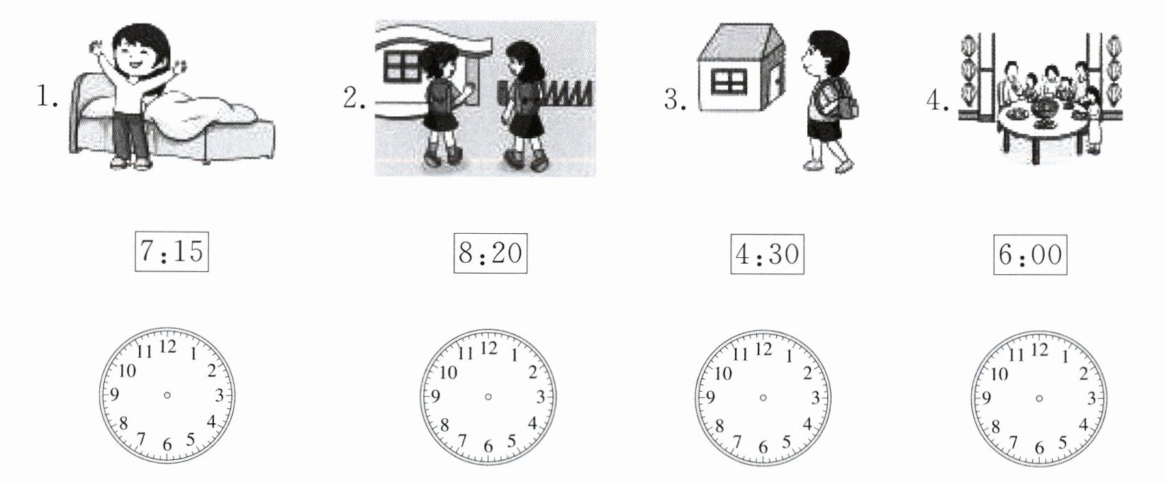 Ⅱ. 玲玲正在讲述她一天的时间安排。请你仔细观察,在钟表上画出正确时间。(12 分)