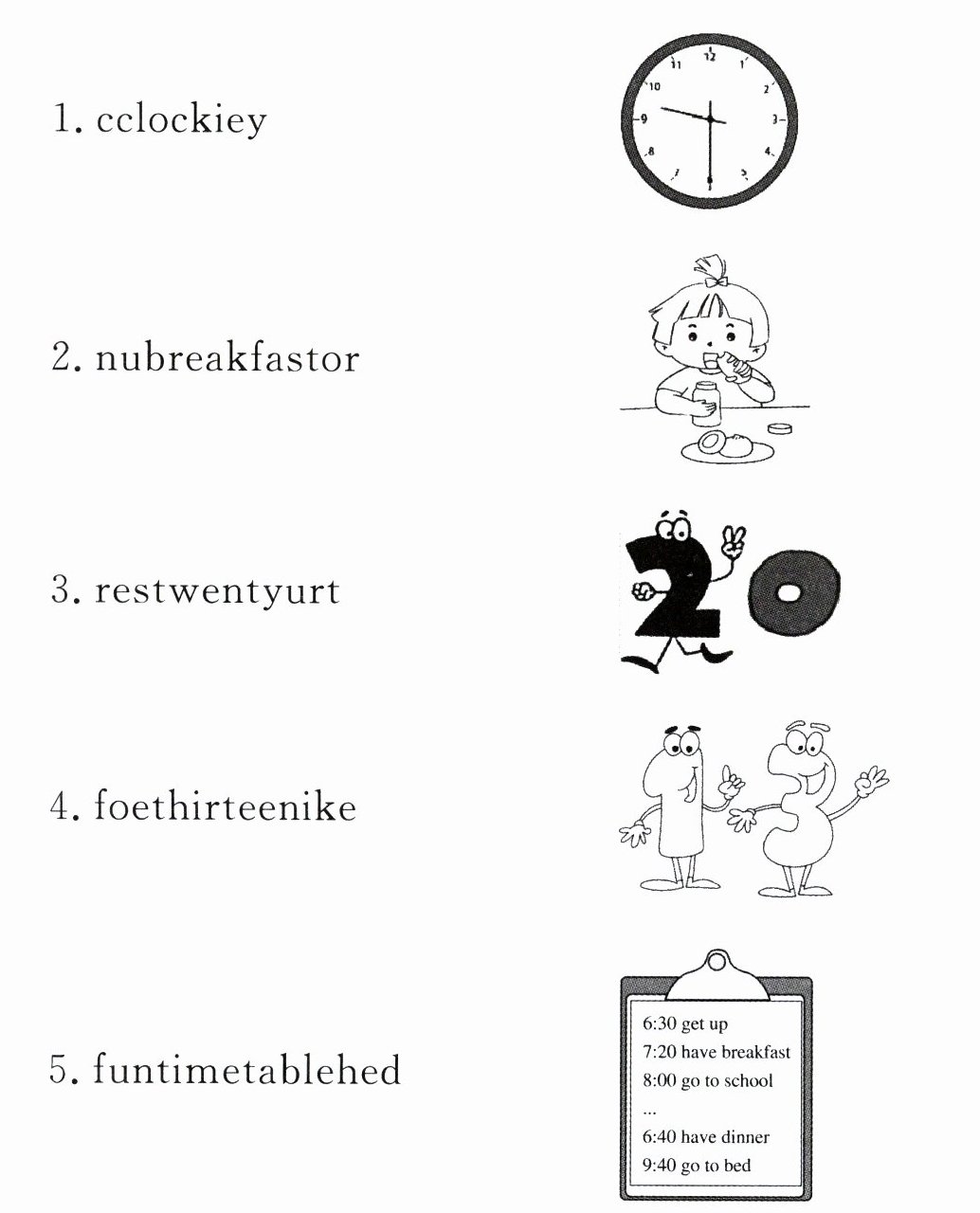 Ⅰ.1.clock 2.breakfast 3.twenty 4.thirteen 5.timetable