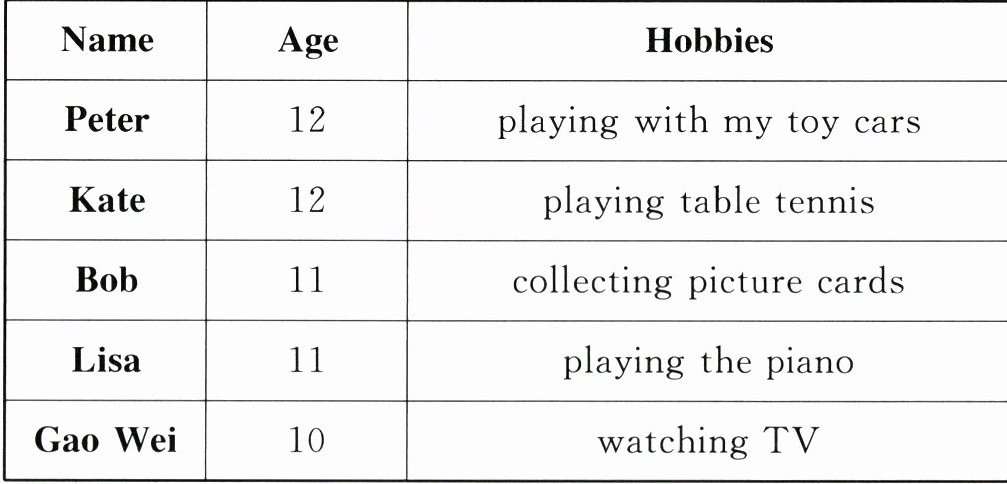 My twin sister Kate is 12, too. Her hobby is playing table tennis. My brother Bob is one year younger than me. He likes collecting picture cards. I have two friends, Lisa and Gao Wei. Lisa is as old as my brother. She likes playing the piano. Gao Wei is the youngest. He is ten. He is interested in watching TV.