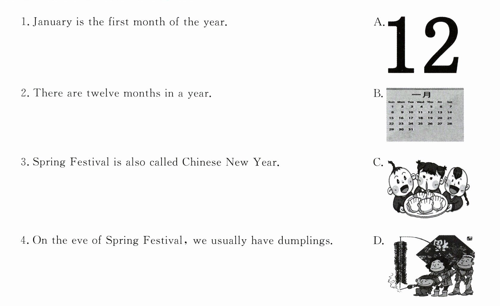 On Chinese New Year’s Eve, when midnight comes, people often say, “Happy New Year!” to each other. Dumplings are favourite food for Chinese New Year. In many Western countries, people let off (燃放) fireworks at midnight to celebrate New Year.