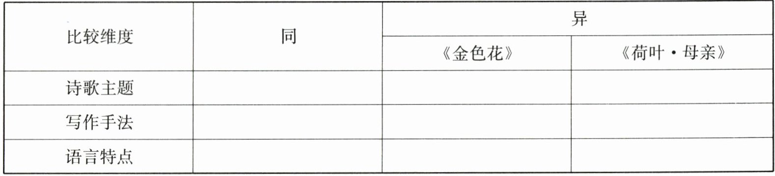 6.诗歌主题:同:都以儿童的视角,满怀热情地歌唱儿童的世界,歌颂了真挚的母爱。异:《金色花》更侧重于突出儿童的真与善,在凸显儿童的真与善中,表达儿童对母亲的依恋,从而表达出对人世间至真亲情的歌颂。《荷叶·母亲》更侧重于直接歌颂母爱,以荷叶、红莲的意象,凸显母爱的伟大与无私。