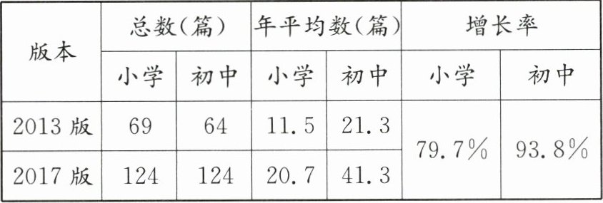 (1)人民教育出版社中小学语文课本2017版较2013版中古诗文总篇数增加近一倍,学生年平均读古诗文篇数增加近一倍,增长率大幅度提高,其中中学的增长率比小学高。