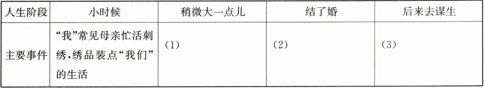 解析:作者围绕“刺绣时光”,写了两代人的生活——母亲执着于手工刺绣;“我”在母亲的感染下,拿起笔,刻画生活。分析时,不要只分析“母亲”这一方面,要注意分析全面。