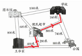 1. 王华从家出发,先到图书馆看书,再到超市买矿泉水。王华要走多少米?(5 分)
