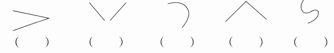 一、下面的图形中,哪些是角,哪些不是角?是角的在图形下面的括号里画√。(5分)