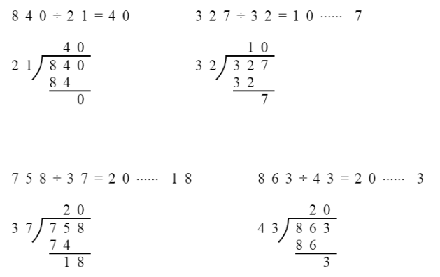 $840÷21=$ $327÷32=$ $758÷37=$ $863÷43=$