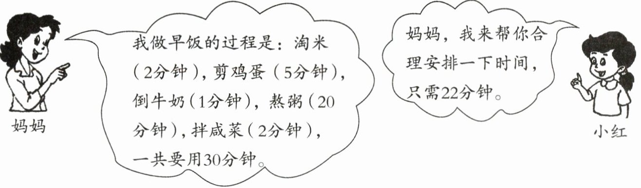 1.做早饭的过程调整为:淘米(2分钟),熬粥(20分钟),熬粥时,煎鸡蛋(5分钟)、倒牛奶(1分钟)、拌咸菜(2分钟),一共要用22分钟。