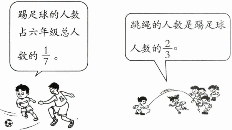 $3. 420 × \frac{1}{7} × \frac{2}{3} = 40($人) 提示:先求踢足球的人数,再求跳绳的人数。