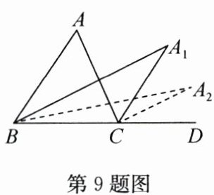 9. 如图,已知 $ \triangle ABC $ 的内角 $ \angle A = \alpha $,分别作内角 $ \angle ABC $ 与外角 $ \angle ACD $ 的平分线,两条平分线交于点 $ A_1 $,得 $ \angle A_1 $;$ \angle A_1BC $ 和 $ \angle A_1CD $ 的平分线交于点 $ A_2 $,得 $ \angle A_2 ·s ·s $ 以此类推,得到 $ \angle A_{2024} $,则 $ \angle A_{2024} $ 的度数是(