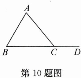 10. 如图,在 $ \triangle ABC $ 中,$ \angle A = 75° $,$ \angle B = 60° $,则外角 $ \angle ACD $ 的度数为