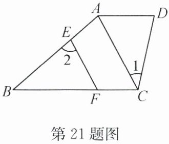 21. 如图,AC是四边形ABCD的对角线,∠1=∠B,点E,F分别在AB,BC上,BE=CD,BF=CA,连接EF。(1)求证:∠D=∠2;(2)若EF//AC,∠D=78°,求∠BAC的度数。