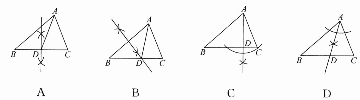 2. 已知△ABC,下列尺规作图的方法中,能确定∠BAD=∠CAD的是(