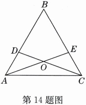 14. 如图所示,在等边△ABC中,D,E是边AB,BC上的两点,且AD=CE,AE与CD交于点O,若∠DOE=140°,则∠OAC=