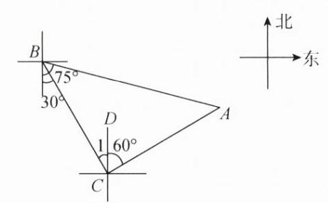 7.D 解析:根据题意知$\angle 1 = 30^\circ$. $\because \angle ACD = 60^\circ$, $\therefore \angle ACB = 30^\circ + 60^\circ = 90^\circ$. $\because \angle CBA = 75^\circ - 30^\circ = 45^\circ$, $\therefore \triangle ABC$为等腰直角三角形. $\because BC = 50 \times 0.5 = 25$(海里), $\therefore AC = BC = 25$海里.