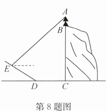 8.D 解析:如图,过点$E$作$EF \perp CD$交$CD$的延长线于点$F$,过点$E$作$EM \perp AC$于点$M$. $\because$斜坡$DE$的坡度(或坡比)$i = 1:2.4$, $DE = CD = 78$米, $\therefore$设$EF = x$米,则$DF = 2.4x$米. 在$\text{Rt} \triangle DEF$中, $EF^2 + DF^2 = DE^2$,即$x^2 + (2.4x)^2 = 78^2$,解得$x = 30$, $\therefore EF = 30$米, $DF = 72$米, $\therefore CF = DF + DC = 72 + 78 = 150$(米). $\because EM \perp AC$, $AC \perp CD$, $EF \perp CD$, $\therefore$四边形$EFCM$是矩形, $\therefore EM = CF = 150$米, $CM = EF = 30$米. 在$\text{Rt} \triangle AEM$中, $\because \angle AEM = 43^\circ$, $\therefore AM = EM \cdot \tan 43^\circ \approx 150 \times 0.93 = 139.5$(米), $\therefore AC = AM + CM = 139.5 + 30 = 169.5$(米), $\therefore AB = AC - BC = 169.5 - 144.5 = 25$(米).故选D.