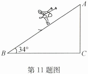 11. 如图,一名滑雪运动员沿着倾斜角为 $ 34^{\circ} $ 的斜坡,从 $ A $ 滑行至 $ B $。已知 $ AB = 500 $ 米,则这名滑雪运动员的高度下降了约