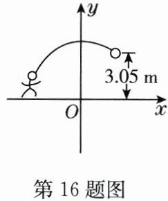 16. (11 分)如图,一位篮球运动员投篮后,球沿抛物线 $ y = -\frac{1}{5}x^2 + \frac{7}{2} $ 运动,然后准确落入篮筐内。已知篮筐的中心离地面的高度为 $ 3.05m $。