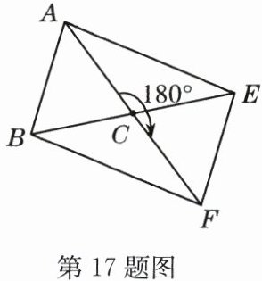 17. (12分)如图,将$ \triangle ABC $绕点C顺时针旋转$ 180^{\circ} $得到$ \triangle FEC $,连接AE,BF。