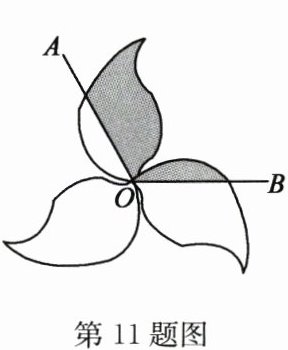 11. 如图所示的图案由三个叶片组成,绕点 $O$ 旋转 $120°$ 后可以和自身重合,若每个叶片的面积为 $4\ cm^2$,$\angle AOB = 120°$,则图中阴影部分的面积和为